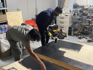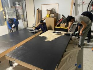 On Day 2, Adarsh and his team finished up the drilling and started to paint. They painted the stages black. This stage also took a while because the stages are quite long and wide and it’s hard paint in the middle of the plank.